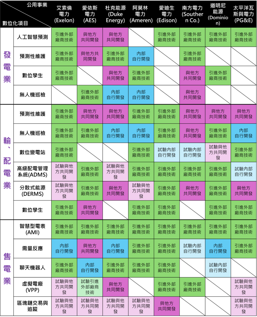 如圖2所示,北美公用事業的數位化實施路徑正經歷由單純「外部技術採購」轉向「共同開發(Co-development)」的策略轉移 。受聯邦政府《電網韌性與創新夥伴計畫》(GRIP)的大規模資金挹注影響,數位化專案高度集中於強化電網韌性、資安防護與先進配電管理系統 。雖然有智慧型電表(AMI)等成熟技術,業者仍以引進外部廠商解決方案為主,但在人工智慧預測、虛擬電廠(VPP)與分散式能源管理系統(DERMS)等新興領域,電力公司傾向與微軟等科技巨頭或 AI 新創建立深度夥伴關係,藉此內化關鍵研發能力,確保電力系統的穩定性 。
