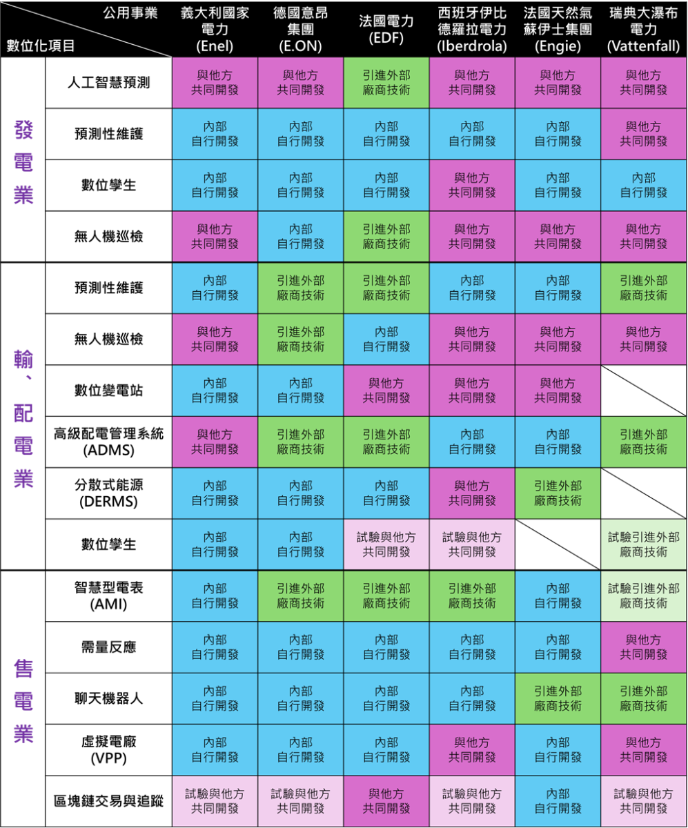 如圖3所示亦反映了歐洲電業以「系統重構與商業輸出」為核心的發展樣態。相較於其他區域,歐洲公用事業展現出極高的技術自主性,領先電業在數位孿生、預測性維護及電網控制等核心領域,高度採取內部自行開發模式。此策略不僅旨在提升內部營運效率,更進一步將研發成果商品化,透過成立專屬數位子公司對外輸出技術服務 。此外,歐洲亦結合區塊鏈技術推動點對點電力交易(P2P)試點,將數位化視為推動跨國電網整合與能源轉型市場機制創新的基礎建設。